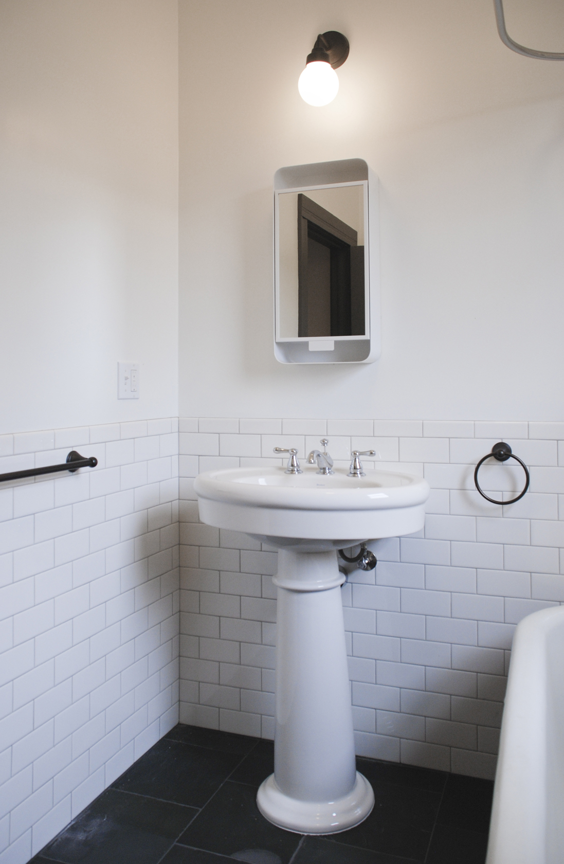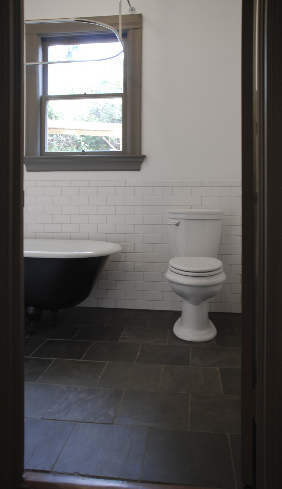 - Bathroom has slate floors, clawfoot tub and pedestal sink.
